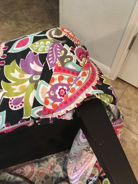 Here are some pics of the process. We did not take off the original fabric. We just covered it. (By we, I mostly mean Freddy.) We weren't able to remove the feet, so that complicated things. We used lots of pleating and folding to get a clean look.